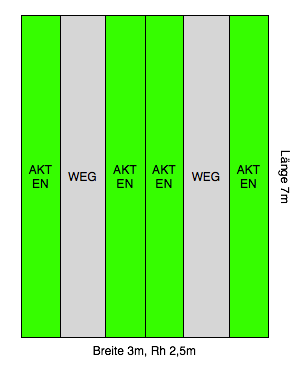 Wählen wir nun eine Lagerbox, in der wir links und rechts aussen eine Aktenwand anbringen können, sowie in der Mitte eine beidseitige, und sehen für die Wege dazwischen 70cm vor (das ist eng, aber wenn es gut organisiert ist, und nicht oft gebraucht wird, braucht man nicht mehr Breite), so kämen wir mit 3m Breite und 7m Länge, bei einer Höhe von 2,5m aus, das entspricht 52,5m3.