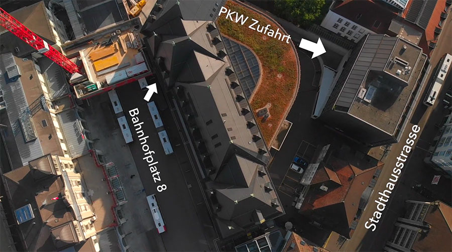 Es ist möglich mit dem PKW über die Bankstrasse, mit einer Sondergenehmigung, welche wir haben und für unsere Kunden verwenden dürfen, in die Parkgarage des Gebäudes zuzufahren, und dort zu entladen.